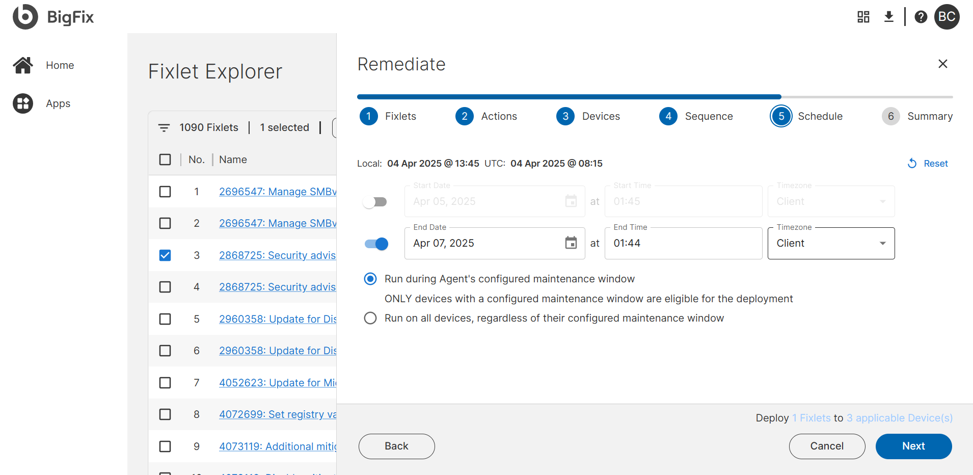 Schedule - not required. Determining a deployment’s start and end time gives BigFix users a tool to control their deployments. Typically, deployments do not happen immediately. Some devices may be powered down, or disconnected from the Internet, or otherwise unable to have the Fixlet applied. Scheduling allows to control how long BigFix will attempt this particular deployment.