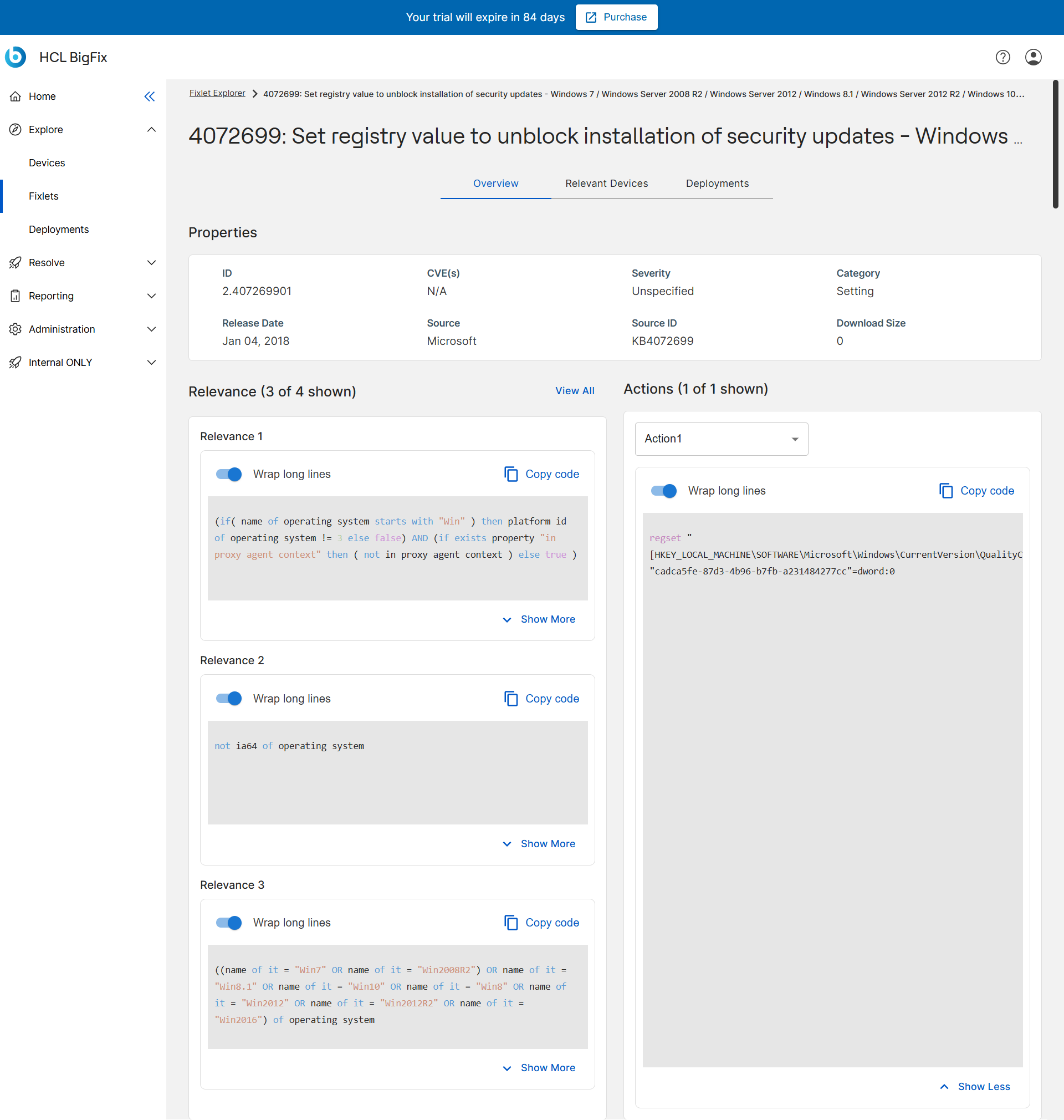 - Relevant Devices Count – Displays the number of devices currently relevant for that Fixlet, helping you quickly gauge its impact or applicability within your environment.