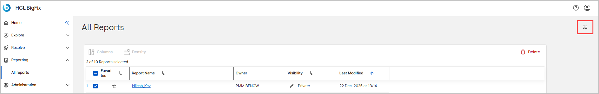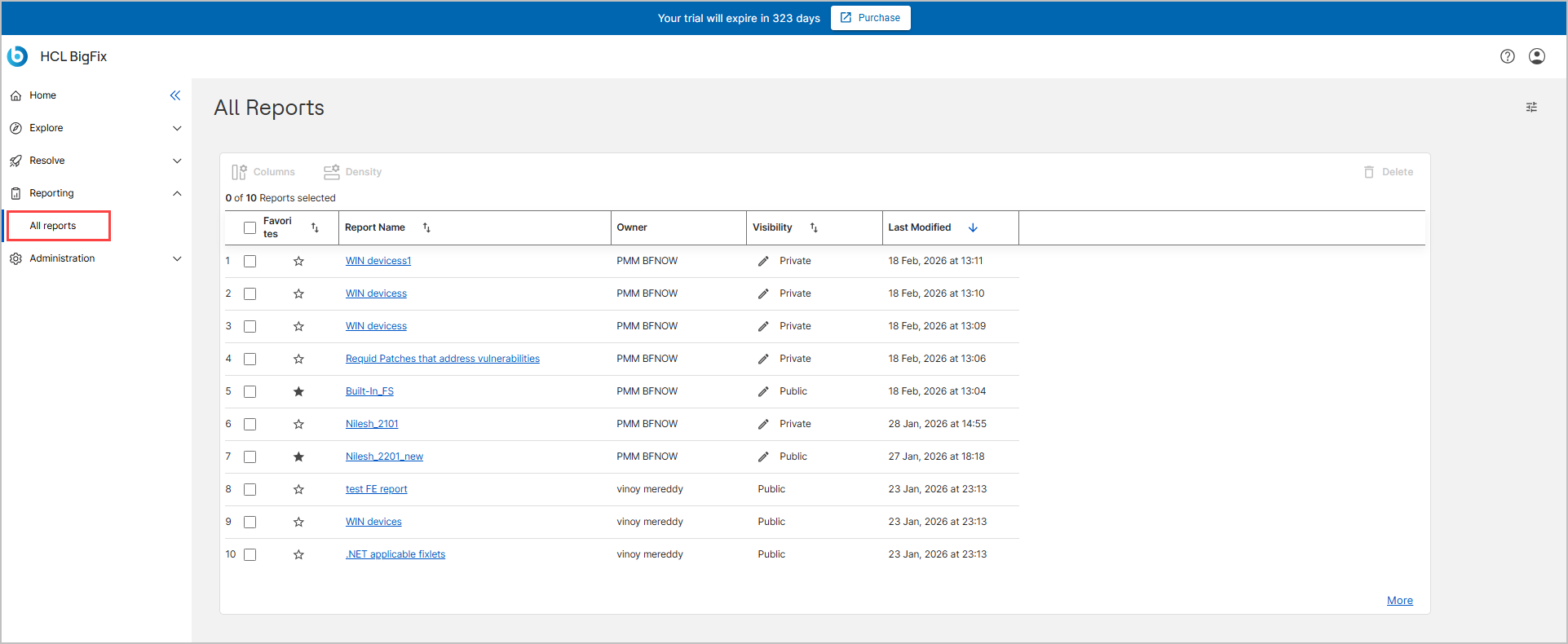 The All Reports page provides a central location to view, manage, and organize all reports available in BigFix SaaS. From this page, you can apply filters, delete reports, and manage report visibility. You can also mark reports as Favorites.