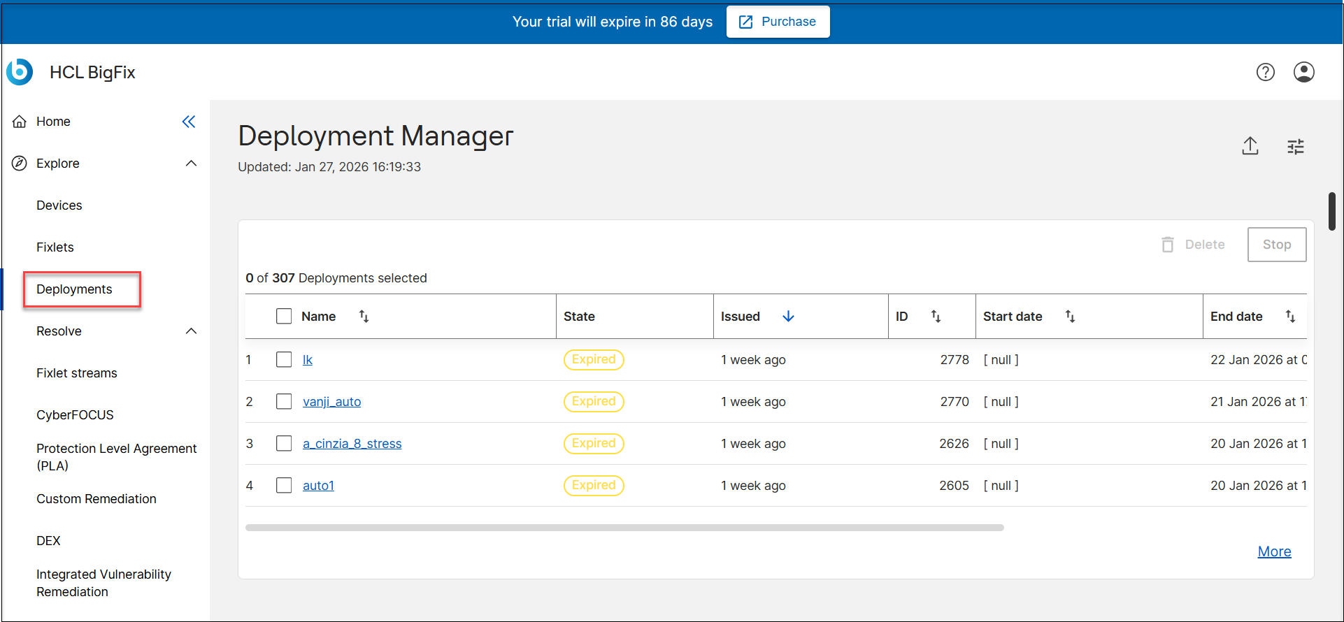 - The Delete button deletes selected deployments from the data table so that they will no longer be displayed. Only Expired deployments may be deleted. To delete an Active deployment, it must first be stopped.