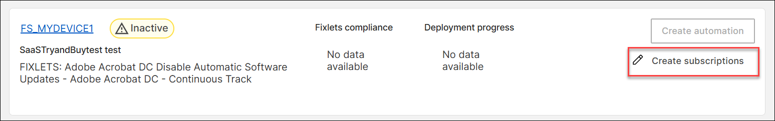 Once the devices are subscribed, the Subscription definition status of the Fixlet Steam changes to "Set", and the Create automation button is enabled to perform the next step.