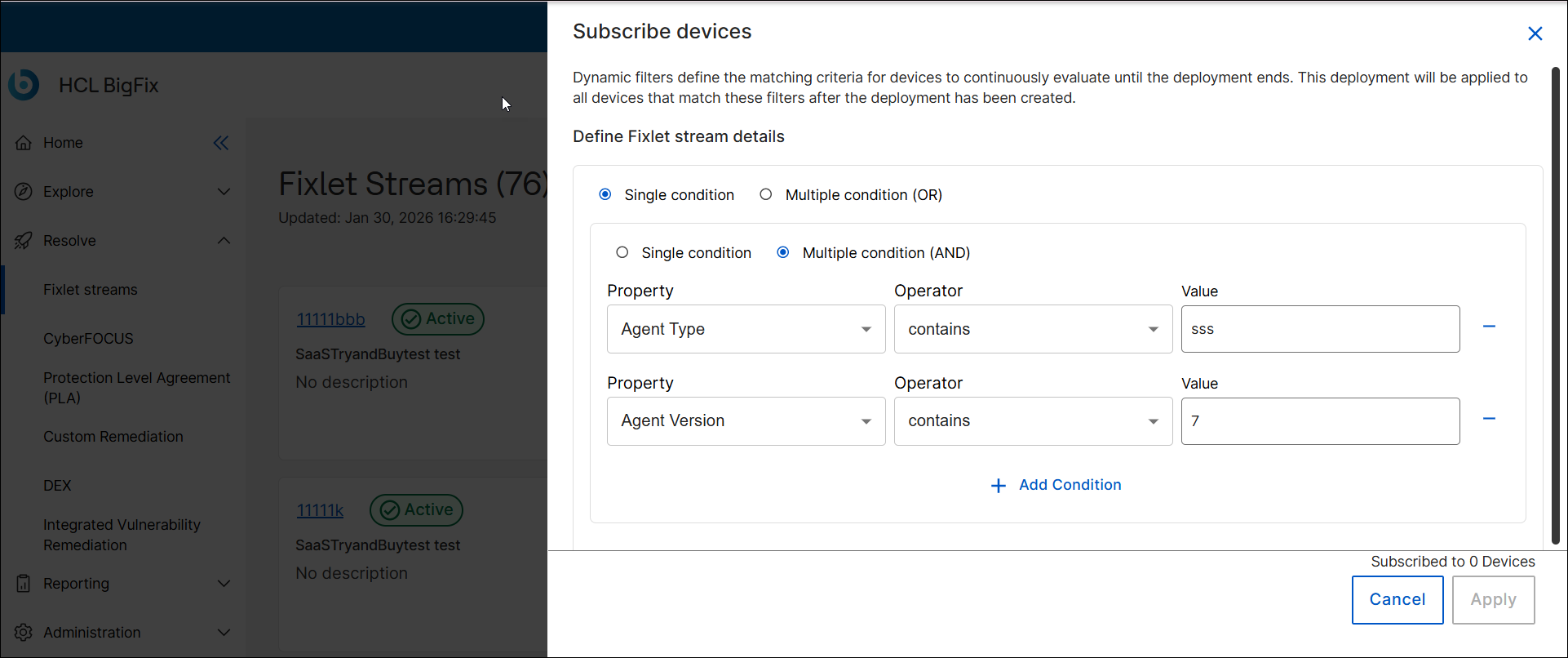 - Click Apply to subscribe devices to the Fixlet Stream. This triggers a continuous evaluation of matching devices.