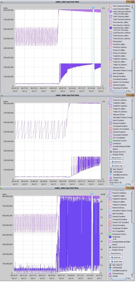 verboseGClog.<af type="nursery" id="8229" timestamp="Dec 18 18:35:39 2013" intervalms="2619.846"> <minimum requested_bytes="16" /> <time exclusiveaccessms="0.154" meanexclusiveaccessms="0.154" threads="0" lastthreadtid="0x000000003489BE00" /> <refs soft="9295" weak="33746" phantom="1717" dynamicSoftReferenceThreshold="8" maxSoftReferenceThreshold="32" /> <nursery freebytes="0" totalbytes="200000000" percent="0" /> <tenured freebytes="1820290728" totalbytes="6979321856" percent="26" > (cont)... </af> <af type="tenured" id="2" timestamp="Dec 14 08:02:09 2013" intervalms="5200781.651"> <minimum requested_bytes="15000000" /> <time exclusiveaccessms="0.150" meanexclusiveaccessms="0.150" threads="0" lastthreadtid="0x0000000032CB6600" /> <refs soft="36012" weak="48498" phantom="1318" dynamicSoftReferenceThreshold="13" maxSoftReferenceThreshold="32" /> <nursery freebytes="355426016" totalbytes="1024000000" percent="36" /> <tenured freebytes="8705208" totalbytes="512000000" percent="1" >In the first entry, you can see that it is requesting to allocate a 16-byte object to the nursery, but the available free bytes are 0. By having a relatively small nursery setting, you can encounter performance issues from the overhead of frequent garbage collections and potentially an OOM error. The more common issue is when the nursery is set to too high, which leaves less space for tenure. The example above shows that the second entry requests a 15 MB object to be allocated to the tenured space. The total heap size is 1.5 GB, but the nursery is set to 1024 MB, which only leaves 512 for the tenured. So when objects are trying to be moved from nursery to tenured, it will fail and likely log an OOM error. With a small tenured space, the JVM can struggle, leading to performance and memory problems.