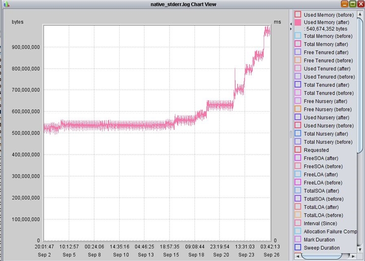 A slow leak will have a slightly different pattern, with a steady increase in memory used over time (multiple days) until eventually getting the OOM error. The following is an example of what it would look like in PMAT. Notice the steady increase of memory used over 20 plus days. As it grows, it never recovers the memory during garbage collection.
