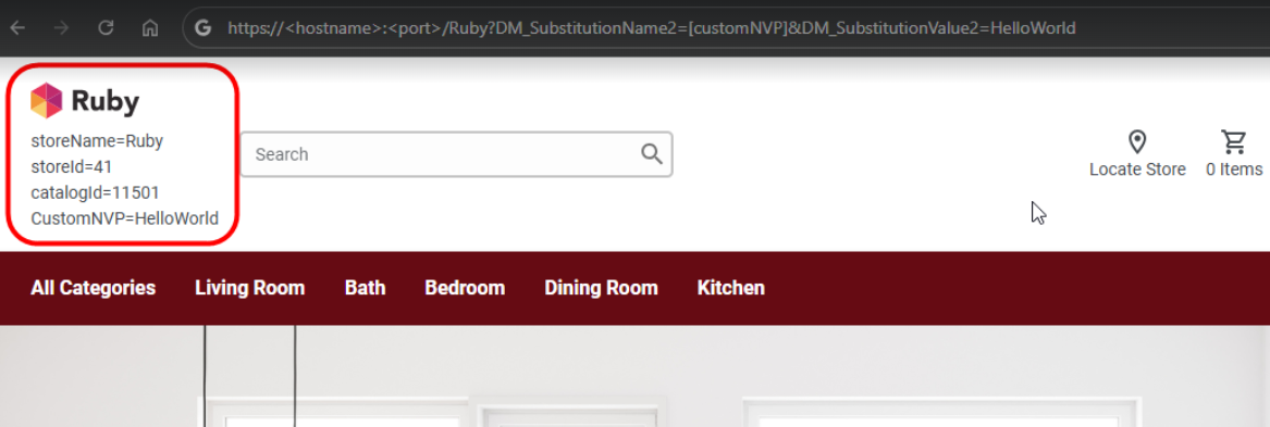 <p>storeName=[storeName]</p> <p>storeId=[storeId]</p> <p>catalogId=[catalogId]</p> <p>CustomNVP=[customNVP]</p> - Locate the existing Ruby storefront HeaderStoreLogo eSpot.