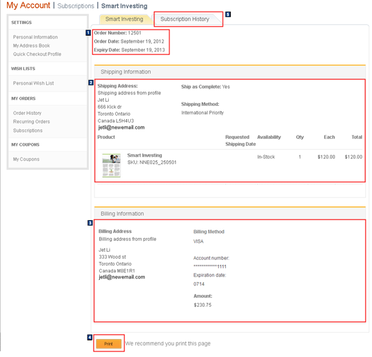 billing information section contains the payment number, and billing address and method. The Print