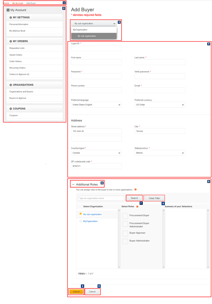 Buyer Administrators for a B2B organization can use the Add Buyer page to create buyer accounts under an organization. Buyer accounts that are created by the Buyer Administrator are automatically activated and can shop the store immediately; even if the organization is configured to require buyer approvals.
