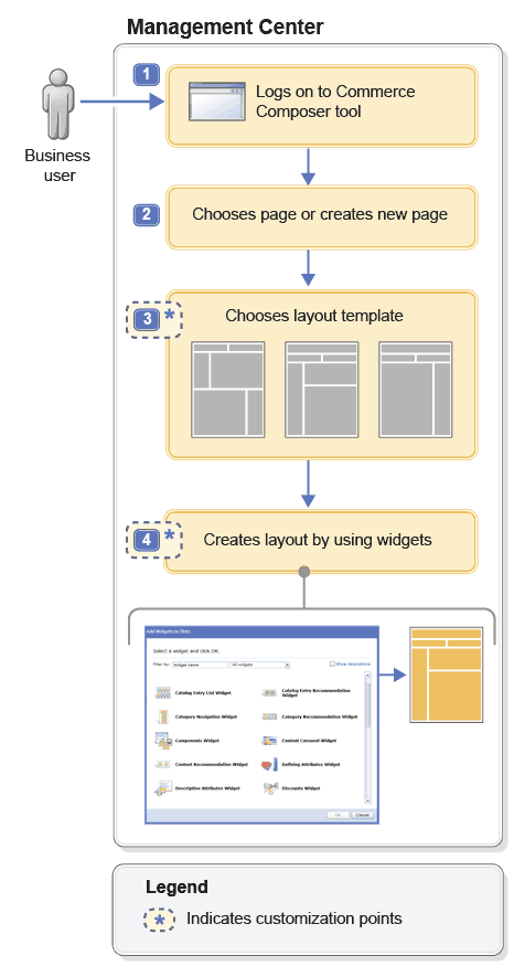 A layout is an arrangement of Commerce Composer widgets within a layout template that retrieve and display different artifacts to render a store page. When a shopper views a page, the Commerce Composer framework resolves the appropriate layout to use for the page for that point in time. The Commerce Composer framework then uses the layout contents and design to render the page for the shopper to view.