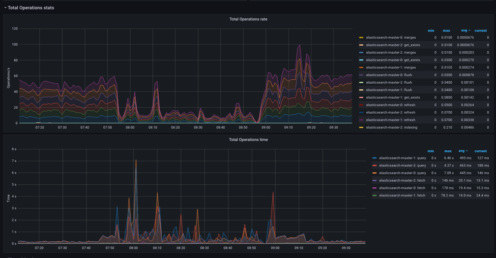 - Este panel muestra la velocidad a la que se realizan las operaciones en el clúster de Elasticsearch, desglosadas por operaciones de indexado, búsqueda, obtención y eliminación.