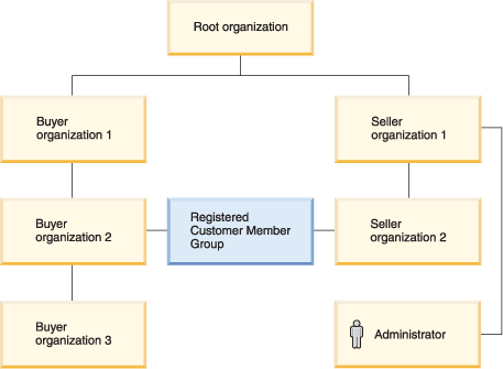 Por ejemplo, si la Tienda A se crea bajo la Organización vendedora A, y la Organización compradora 1 y la Organización compradora 2 están registradas con la Tienda A, habrá un grupo de miembros de clientes registrados (RegisteredCustomers) propiedad de la Organización vendedora A. Un Administrador de vendedores de la Organización vendedora A puede realizar la mayor parte de las funciones, como si tuviera asignado el rol de Administrador de vendedores para la Organización compradora 1 y la Organización compradora 2. El administrador también puede acceder a los usuarios que pertenecen a la Organización compradora 1 y la Organización compradora 2.