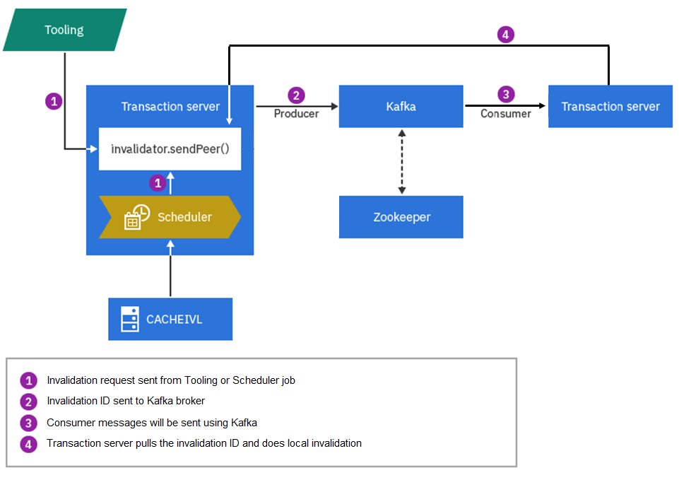 Puede utilizar Apache Kafka y Apache ZooKeeper para invalidar la memoria caché. Los trabajos de invalidación se pueden ejecutar desde servidores locales o remotos.