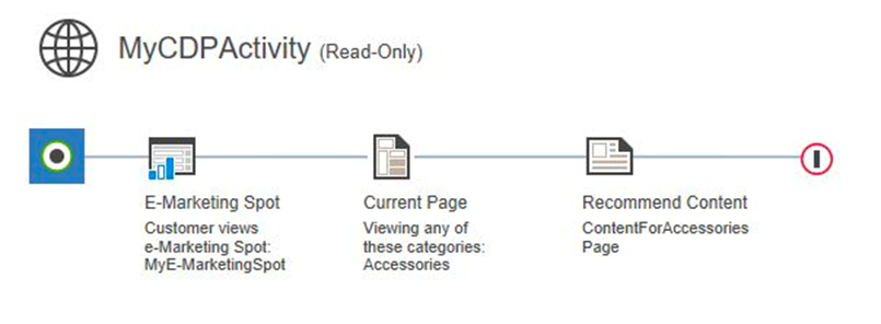 MarketingEngineCache getActivity Activity flow: <Flow> <FlowElement type=Trigger id=11406 ></FlowElement> <FlowElement type=Target id=11408 ></FlowElement> <FlowElement type=Action id=11407 repeat=true ></FlowElement> </Flow> - Cada desencadenante, destino y acción tiene un comando de tarea que se encarga de implementar el elemento correspondiente. Por ejemplo, si el siguiente elemento de la actividad web es Destino: Página actual.