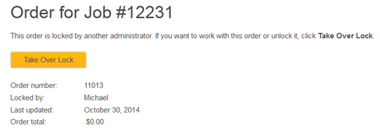 Para bloquear un pedido actual que está bloqueado por un administrador diferente : Nota: Es posible que desee comprobar con el administrador quién ha bloqueado el pedido antes de tomar el control de un bloqueo. Para ver quién ha bloqueado el pedido, Pulse el número de pedido. Se visualiza la página de Pedido actual y un mensaje indica quién ha bloqueado el pedido. No se puede tomar el control de un bloqueo de la página Pedido actual.