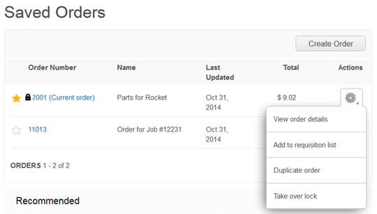- En la página de pedidos guardados, el Administrador de compradores expande el menú Acciones para un pedido y, a continuación, pulsa Tomar el control del bloqueo. Ni otros administradores de compradores ni el comprador pueden editar el pedido simultáneamente.