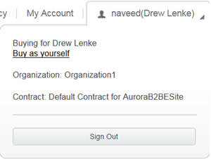- El administrador de compradores hace clic en el nombre de un comprador (Drew Lenke) y ahora ya puede comprar en nombre de Lenke. El Administrador de compradores puede comprar en la tienda del mismo modo que lo hace el comprador. El panel Iniciar sesión/Registrarse se actualiza con las características siguientes para indicar que se está utilizando la característica de Comprar en nombre de.
