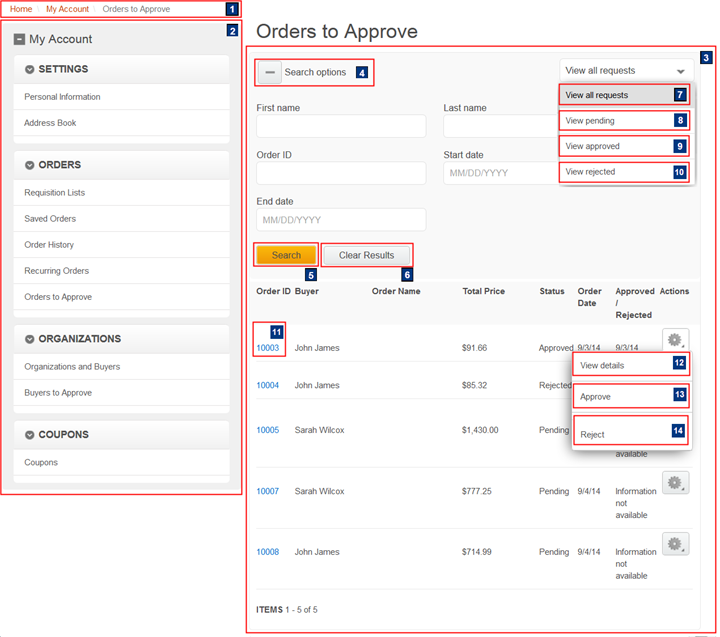 Los aprobadores de compradores o los administradores de compradores de una organización B2B pueden utilizar la página Pedidos por aprobar para ver una lista de los pedidos que están en espera de aprobación. Las opciones de buscar y filtrar están disponibles para buscar rápidamente pedidos específicos. Un menú Acción permite que los aprobadores aprueben o rechacen rápidamente varios pedidos.