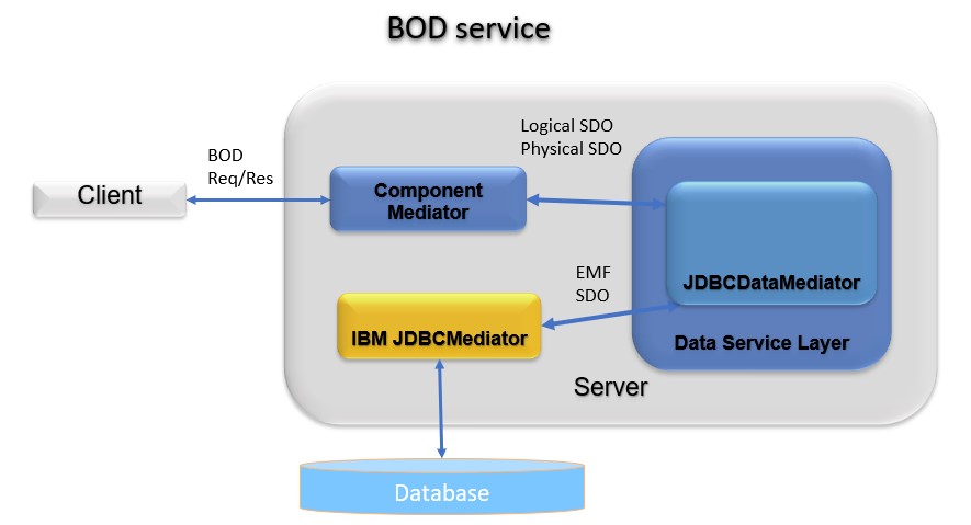 Cuando un cliente envía una solicitud de servicio Documento de objeto de negocio (BOD) al servidor, la infraestructura de servicio BOD del servidor la pasará al mediador del componente correspondiente. Si se trata de una solicitud de cambio o proceso, el área de datos en el BOD es un objeto de datos de servicio (SDO) lógico. El mediador la convertirá en una lista de SDO físicos y JDBCDataMediator de la capa de servicio de datos (DSL) enviará esos SDO físicos a IBM JDBCMediator para que se conserven. Si se trata de una solicitud de lectura, el mediador de lectura obtendrá el XPath y el perfil de acceso en el BOD y lo enviará a la DSL. La DSL obtendrá los SQL relevantes y el JDBCDataMediator en HCL Commerce antes de enviar los SQL a IBM JDBCMediator para recuperar el contenido de la base de datos. IBM JDBCDataMediator creará un gráfico SDO físico basado en el resultado de la consulta proporcionado desde la base de datos y, a continuación, devolverá este gráfico a JDBCDataMediator. Cuando el mediador del componente obtiene el gráfico SDO físico, lo convertirá nuevamente en el SDO lógico y la infraestructura de servicio de BOD creará un BOD y lo enviará de regreso al cliente.