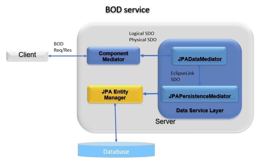 Actualmente, los SDO físicos utilizados en el servicio BOD son SDO de EMF. La capa de persistencia se basa en IBM JDBCMediator para leer y conservar los datos en la base de datos. Como se trata de tecnología propiedad de IBM y no de código abierto, el SDO de EMF se sustituye por el SDO de EclipseLink y la capa de persistencia se sustituye por Java Persistence API (JPA).