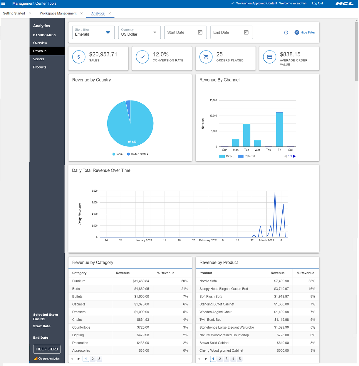 El usuario podrá ver el panel en el Centro de gestión solo después de completar la configuración del panel. La página de Ingresos muestra una información relacionada con los ingresos generados por la tienda seleccionada.
