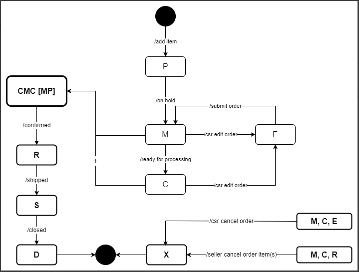 Note: La cancelación de artículos de pedido se comporta de forma diferente en las versiones 9.1.11.0 y 9.1.12.0 de HCL Commerce. En la versión 9.1.11.0 de HCL Commerce, la cancelación de un artículo de pedido suprime físicamente el artículo solicitado del pedido. Para la versión de HCL Commerce 9.1.12.0 y en adelante, la cancelación de un artículo de pedido cambia el estado del artículo solicitado a X como indicación de la cancelación. La cancelación del artículo solicitado libera el inventario de artículos y vuelve a calcular el total del pedido ignorando los artículos cancelados del pedido. El estado del pedido permanece sin cambios hasta que se cancelan todos los artículos solicitados.| Estado | Valor | Descripción |