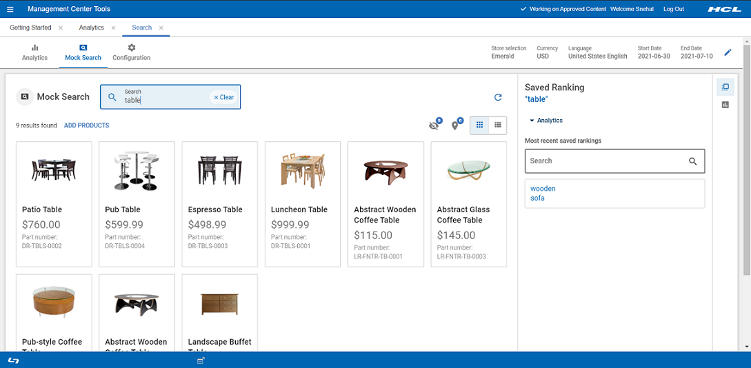 La búsqueda simulada permite a un usuario de empresa gestionar los resultados de la búsqueda, basándose en los términos de búsqueda que los compradores utilizan en su tienda. Un usuario de empresa puede reordenar las entradas del catálogo, fijarlas en una posición permanente u ocultarlas por completo de los resultados de búsqueda de un término. También puede añadir productos al resultado de la búsqueda.