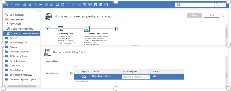 Puede ver el atributo de comercialización asignado en los filtros de búsqueda de las recomendaciones de entradas de catálogo en las actividades de marketing para promocionar algunos productos del vendedor de Marketplace. También puede utilizar estos atributos de comercialización en los filtros de búsqueda para crear reglas de búsqueda que añaden o sustituyen criterios de búsqueda. Puede utilizar los atributos de comercialización de los filtros de búsqueda para buscar entradas de catálogo que asignar a las categorías de ventas y a las categorías de ventas basadas en normas.