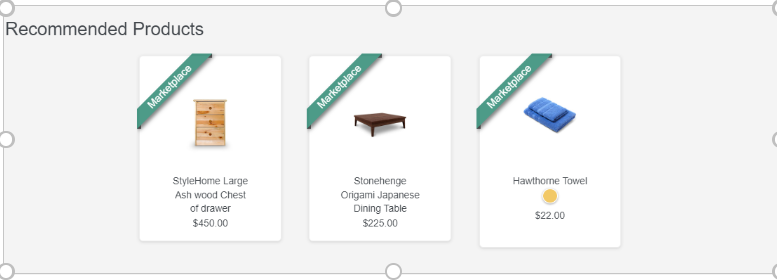 A continuación se muestra un ejemplo de una recomendación de todos los productos vendidos por el Vendedor B en el página de inicio de la tienda Emerald Marketplace.