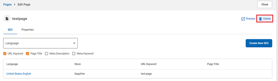 - Se abrirá un recuadro de diálogo Eliminar página. Pulse Suprimir y la página se suprimirá de la lista de páginas creadas para la tienda seleccionada.