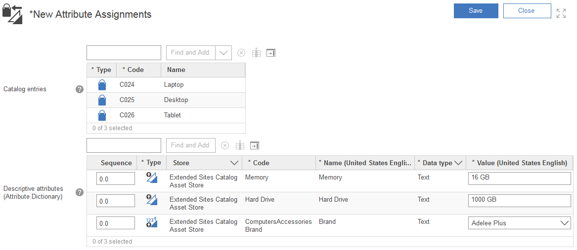 - Si se detectan atributos duplicados para una entrada de catálogo, puede que algunos atributos no se asignen y guarden para la entrada de catálogo. Si un atributo y valor que va a asignar ya existe con el mismo valor para una entrada de catálogo, el atributo se asigna, pero no se guarda, para la entrada de catálogo. Los atributos descriptivos y valores duplicados no se pueden asignar y guardar para una entrada de catálogo.