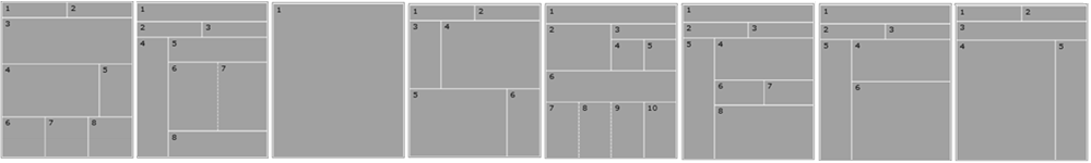 De forma predeterminada, la tienda de inicio Aurora viene se proporciona con varias plantillas de diseño que puede utilizar con la herramienta Commerce Composer. Los usuarios del Management Center pueden utilizar estas plantillas para componer diseños de páginas. Los siguientes son ejemplos de las plantillas que están disponibles mediante la publicación de la tienda de inicio Aurora; los números representan las ranuras de plantilla en las que los usuarios pueden incluir widgets: