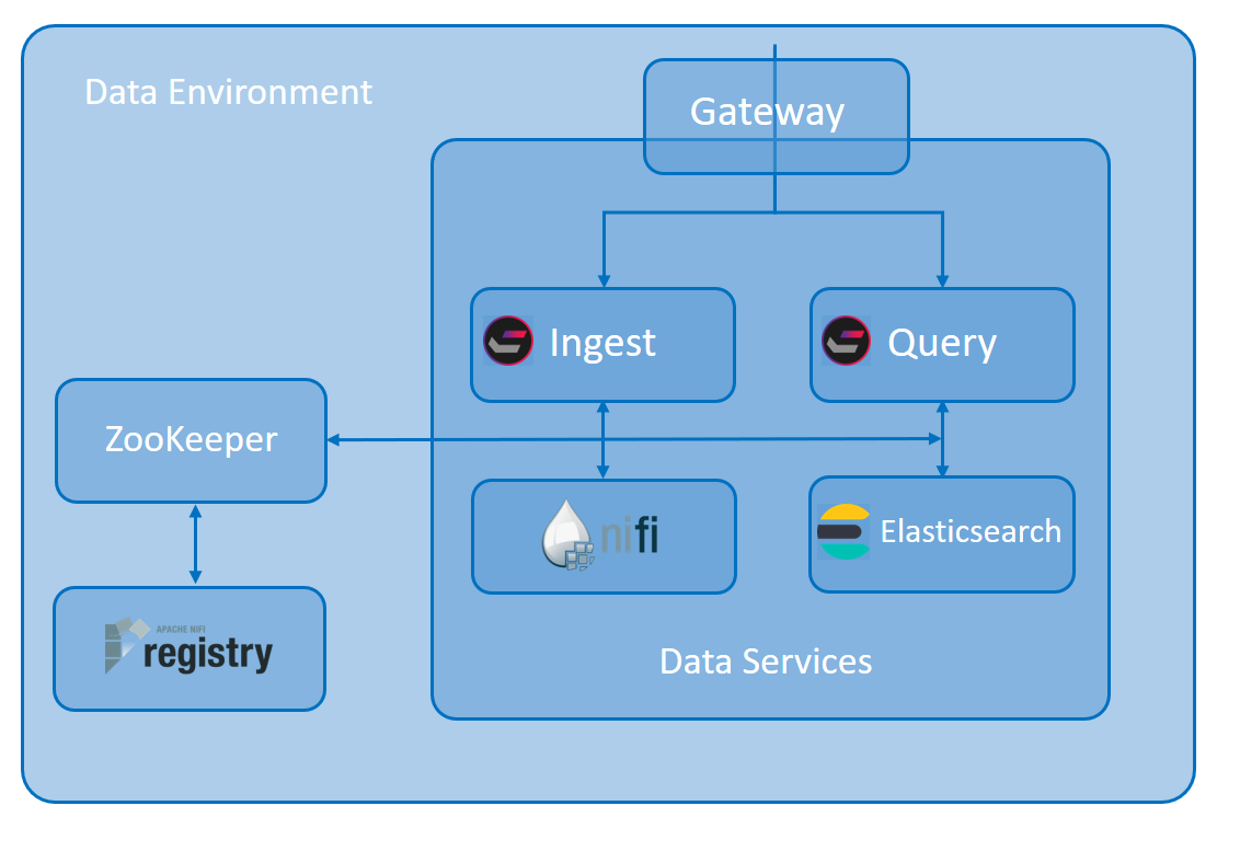 La solución de búsqueda de Elasticsearch es un componente de un entorno de datos unificado. Este entorno está diseñado como un sistema de gestión de datos genérico. El entorno incluye varios componentes principales, incluidos la pasarela, los servicios de datos y el sistema de gestión de configuración ZooKeeper.