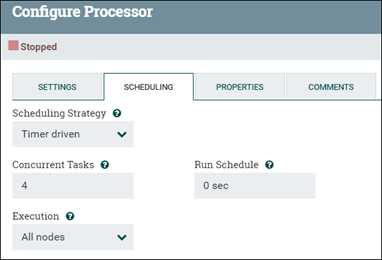 El grupo de datos de procesamiento controla la cantidad de trabajo que NiFi puede realizar. Por ejemplo, puede regular cuántos archivos de flujo pueden procesarse simultáneamente controlando el recuento de hebras del procesador. Esto aumenta la velocidad de procesamiento de un procesador típico, lo que potencialmente mejora la acumulación de los archivos de flujo frente al procesador. Por ejemplo, el procesador NLP es un procesador típico que se beneficia significativamente de las hebras adicionales. Puede controlar cuántas conexiones realiza simultáneamente a Elasticsearch utilizando el procesador de actualización masiva más especializado, lo que le permite importar más datos a Elasticsearch.