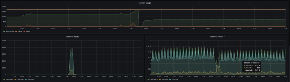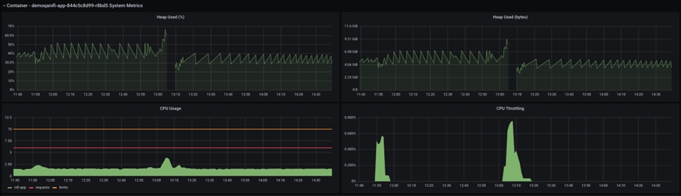 Aquí se muestra la memoria total asignada al pod, y puede ver que la memoria solicitada está alcanzando el máximo de memoria asignada en el momento de la caída de la JVM de NiFi. Como resultado, se debe asignar más memoria para dar cabida a un tamaño de grupo más grande.
