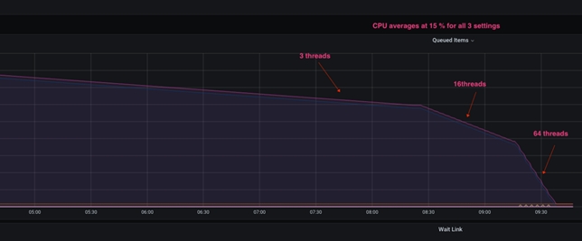 Cuando el procesador de actualizaciones masivas se configura con solo tres hebras, la configuración inicial muestra un agotamiento muy superficial de los documentos. Cuando se configura con hebras 16, el ángulo de bajada de rampa aumenta significativamente, y cuando se configura con hebras 64, mejora aún más. La distinción importante es que el aumento del número de hebras en este procesador aumenta el número de conexiones HTTP abiertas desde NiFi a Elasticsearch, mientras que la utilización de CPU resultante permanece casi sin cambios.