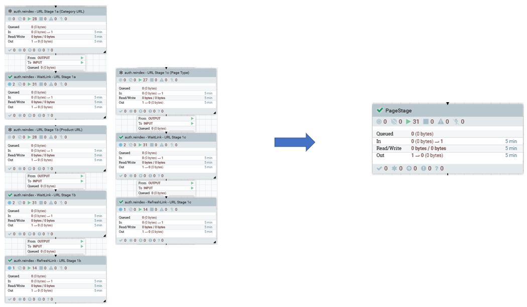 - En el modelo de indexación de eSite, la indexación de URL incluye tres etapas en las que se procesan productos, categorías y páginas. En el modelo de tienda con elementos, estas etapas se sustituyen por una etapa de página, que procesa los tres tipos juntos. Esto simplifica en gran medida el proceso de indexación y mejora el rendimiento.