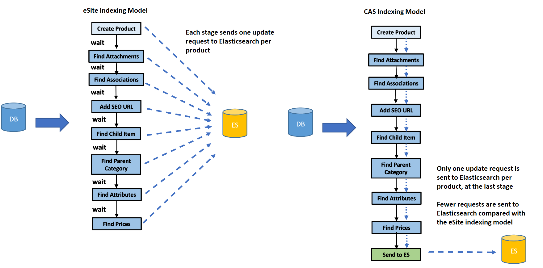 El flujo de canalización de la indexación CAS es muy similar al modelo de eSite, pero el diseño del flujo de datos interno es bastante diferente: