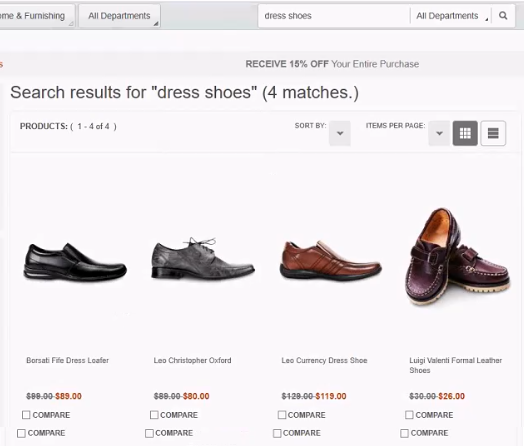 Por ejemplo, si busca en la tienda de ejemplo Aurora el término zapatos de vestido (no entre comillas), los resultados serán ligeramente diferentes dependiendo de si utiliza Solr o el servicio de consulta v9.1. Una búsqueda de Solr devolverá alrededor de 100 elementos del catálogo, porque busca cada instancia de las palabras "vestido" y "zapatos".