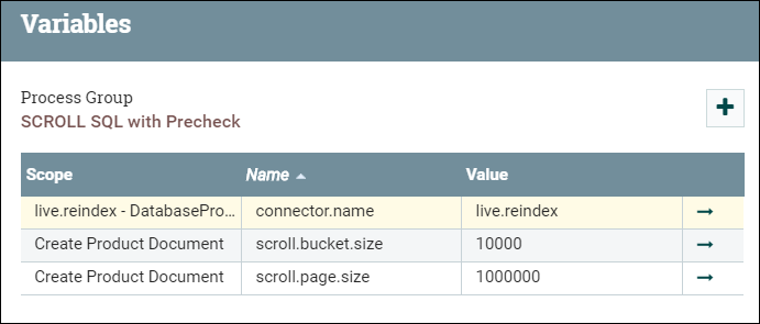 Ingrese al grupo SCROLL SQL, luego haga clic con el botón derecho en el lienzo base y seleccione las variables.- scroll.page.size es el número de filas captadas de la base de datos por el SQL.