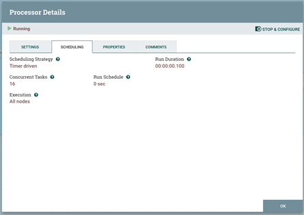 En NiFi, cada procesador tiene la capacidad de procesar archivos de flujo de forma paralela. Para ello, asigne más hebras al CPU o aumente la variable de trabajos simultáneos por encima de 1. El procesador NLP en la siguiente instantánea está configurado para 16 tareas simultáneas, lo que corresponde a la cantidad de vCPU disponibles en el nodo.
