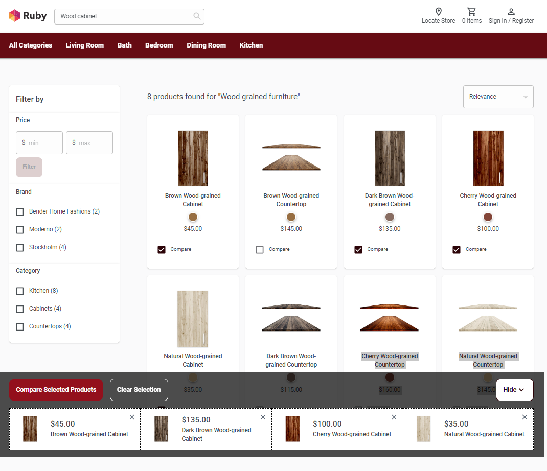 Los productos del PLP tienen recuadros de selección de Comparar que siempre están visibles. Estas casillas de verificación están disponibles para todos los tipos de productos, excepto para kits y paquetes compuestos. Debe seleccionar un mínimo de dos y un máximo de cuatro productos para compararlos en la vista de escritorio. El número máximo de productos para la vista de tableta es de tres.