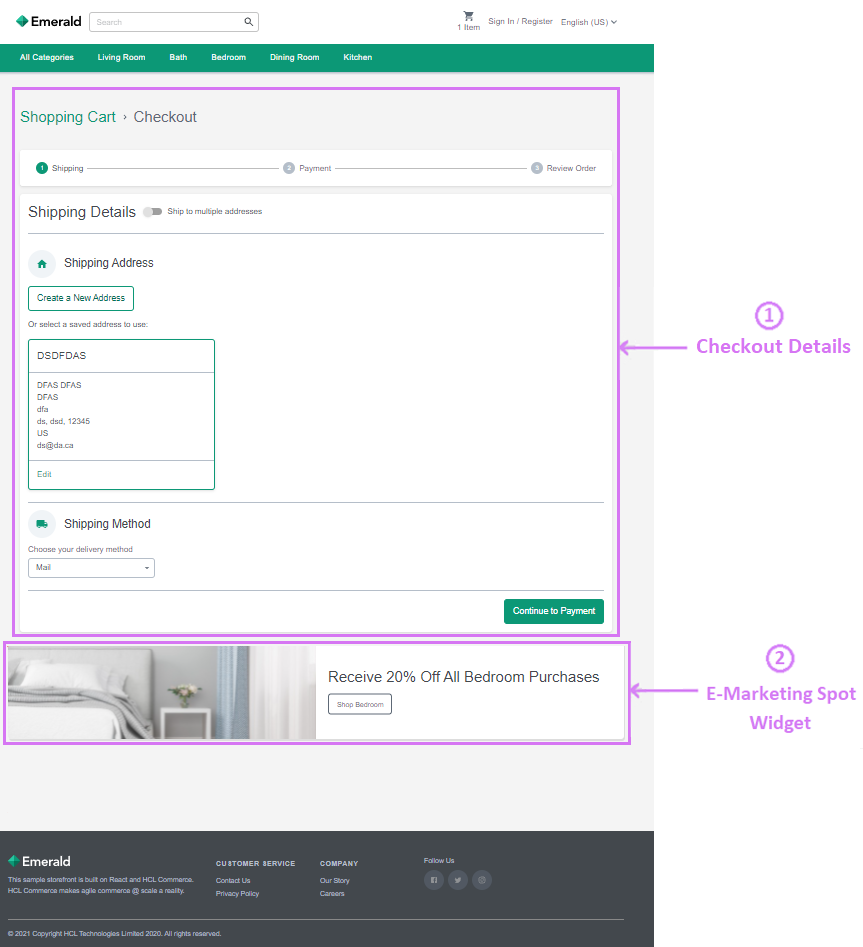 - Detalles de pasar por caja: Muestra los detalles del carro de compra, incluida la dirección de envío y los detalles de pago, el valor final del carro de compra para el proceso de paso por caja.