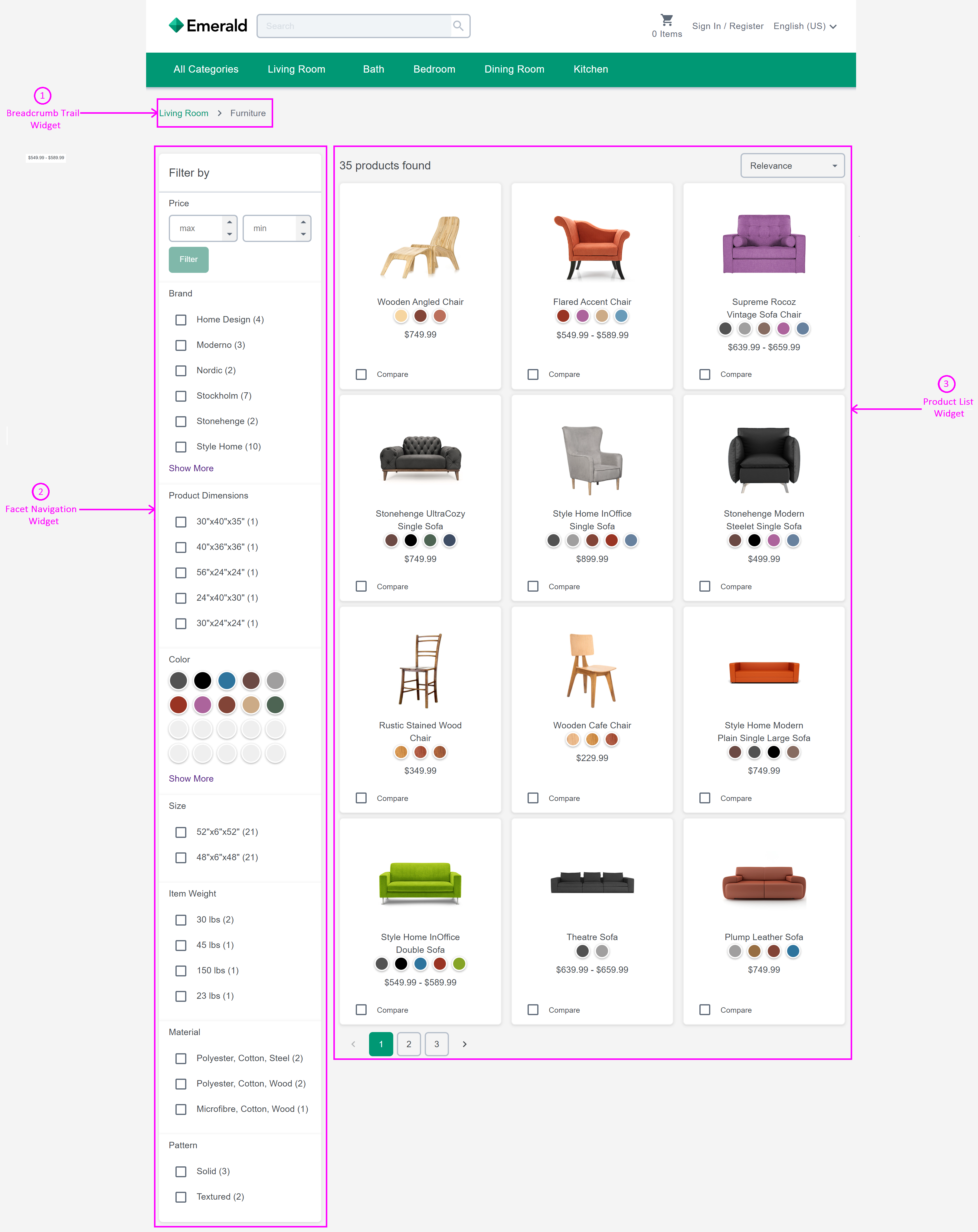 - Navegación por facetas: Muestra un filtro por facetas en una página de categoría-listado de productos.