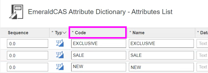 Las cintas publicitarias se asignan en función de los cuatro tipos de código del Diccionario de atributos de la tienda con elementos de catálogo, tal y como se muestra en la imagen siguiente. Estos códigos incluyen Exclusiva, Venta, Nuevo y Liquidación y no distinguen entre mayúsculas y minúsculas. Cualquier otro código aparte de estos se trata como una cinta publicitaria personalizada.