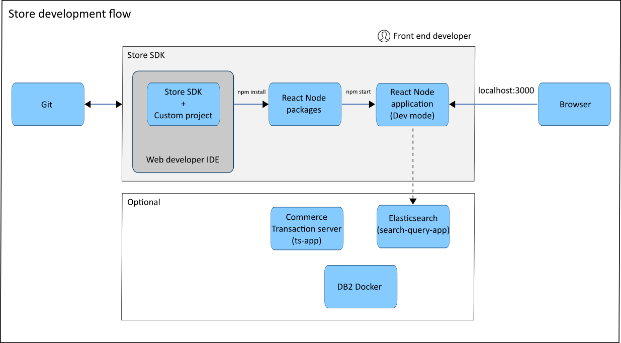 La Store SDK proporciona un entorno flexible en el que un desarrollador web de React puede crear la interfaz de usuario de la tienda. El entorno de desarrollo se puede configurar en las siguientes modalidades: