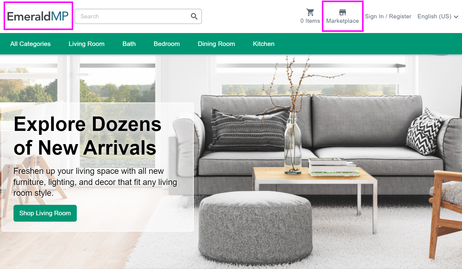 La imagen siguiente muestra un ejemplo de una tienda Emerald habilitada para Marketplace.
