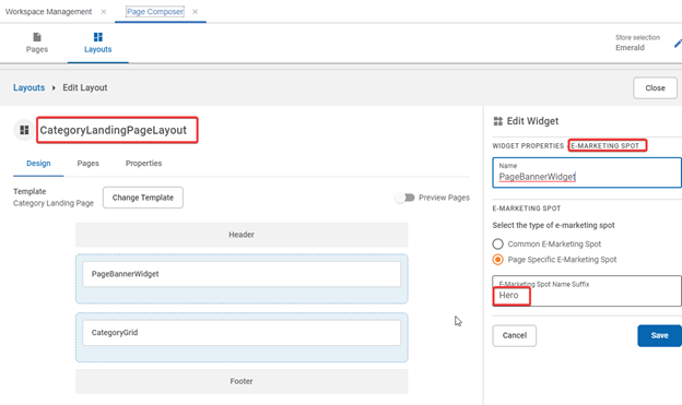 Note: La imagen de arriba muestra la asignación del widget E-marketing Spot en el diseño de la Página de destino de categorías mediante el marketing electrónico específico de la página basado en sufijos.Note: Si no hay ningún diseño válido, se utilizan diseños predeterminados. Se proporcionan en la versión 9170 bajo la carpeta src/configs/default-layout. Su denominación (sin la extensión de archivo) coincide con la columna IDENTIFIER de la tabla PLWIDGETDEF.