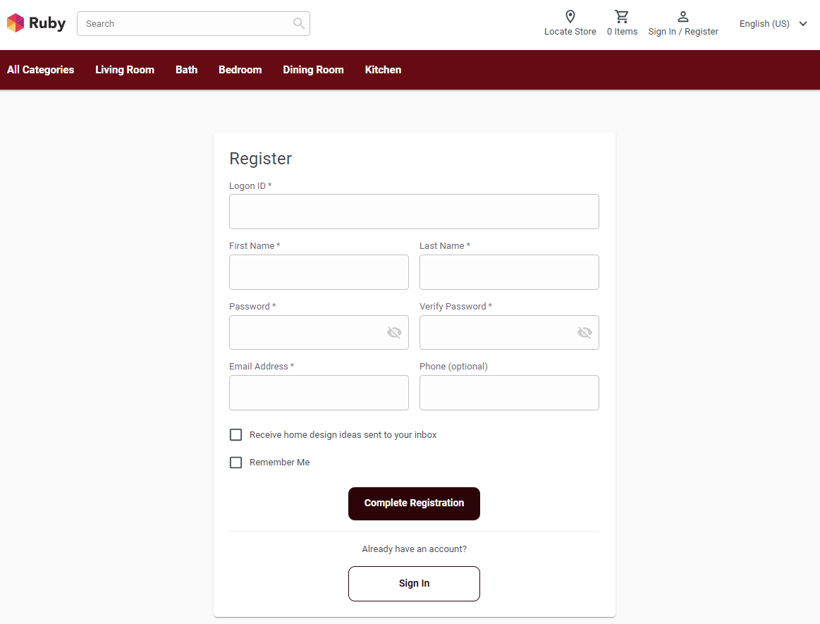 Note: Si el comprador necesita obtener ideas de diseño para el hogar de la tienda basada en React, marque el recuadro de selección Recibir ideas de diseño enviadas a la bandeja de entrada.Note: Si el comprador quiere rellenar sus datos personales, como el ID de inicio de sesión y la contraseña, cada vez que vuelva al sitio, seleccione el recuadro de selección Recuérdame.