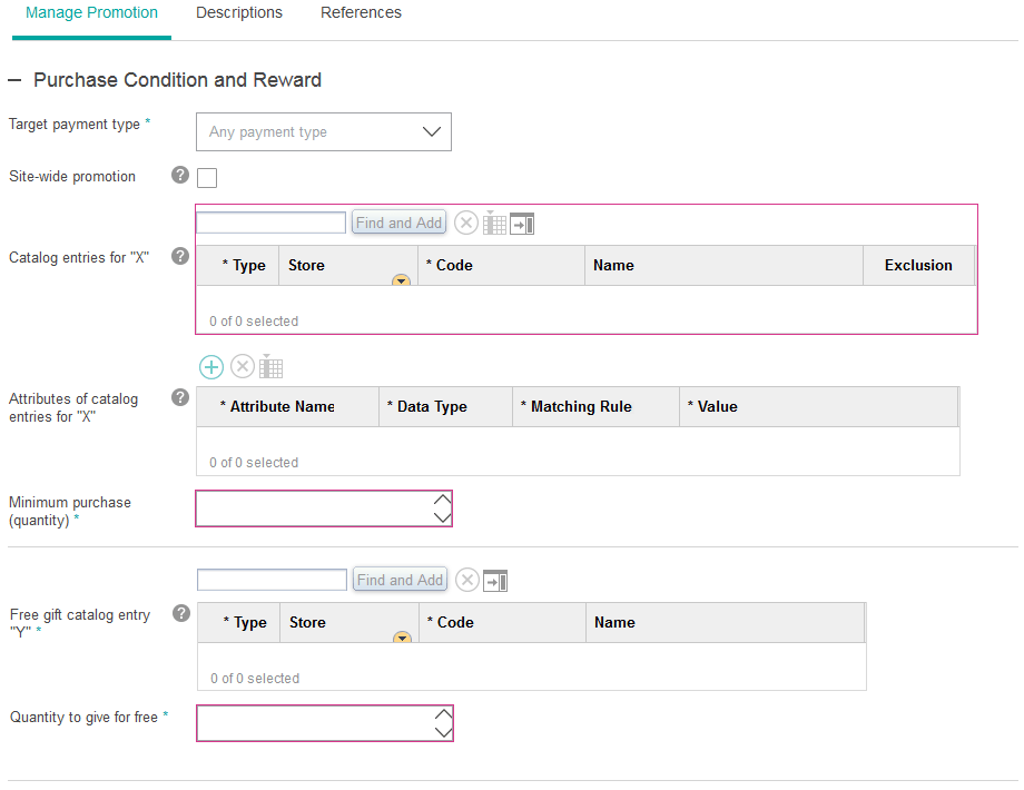 En esta guía de aprendizaje, está basando un nuevo tipo de promoción en el tipo de promoción existente "Compre la entrada catálogo X y obtenga la entrada de catálogo Y gratis", pero modificará los detalles de la condición de compra y la bonificación. Para este tipo de promoción existente, la interfaz de usuario para la sección Condición de compra y bonificación es similar a la siguiente: