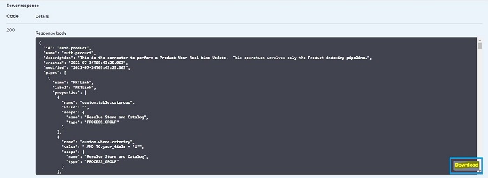 El JSON del descriptor del conector auth.product aparece en el Cuerpo de la respuesta, tal y como se muestra en la siguiente imagen.