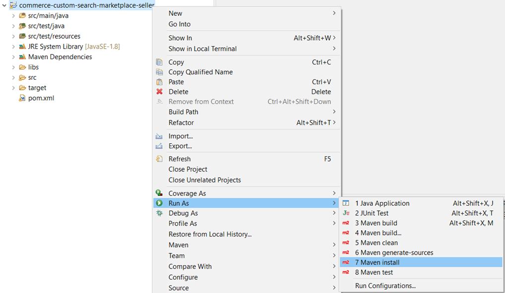 En el Explorador de proyectos, pulse el botón derecho del ratón en Proyecto . Una vez finalizada la compilación, el archivo JAR estará disponible en el directorio de destino de este proyecto, por ejemplo: commerce-custom-search-marketplace-seller-9.1.10.0.jar . Para obtener más información, consulte Procesadores NiFi personalizados.